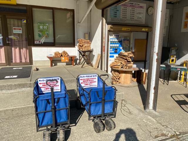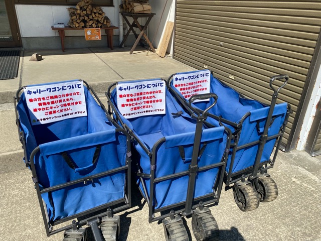 受付前には無料のキャリーワゴンの貸出がありますのでキャンプ道具の運搬には便利ですね。