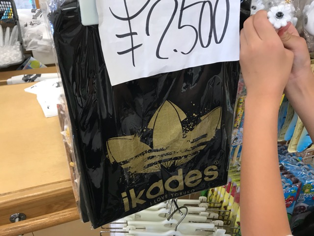お店のレジの前にはアディダスのパロディTシャツが売っていました。