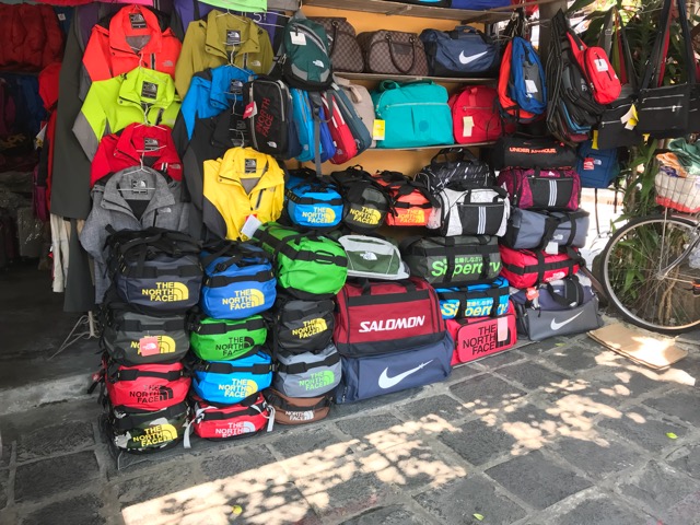 あちこちお店巡りしますが大体置いてる商品は一緒ですね。「THE NORTH FACE」「NIKE」等の本物かどうか判らない物がズラリと並んでいます。