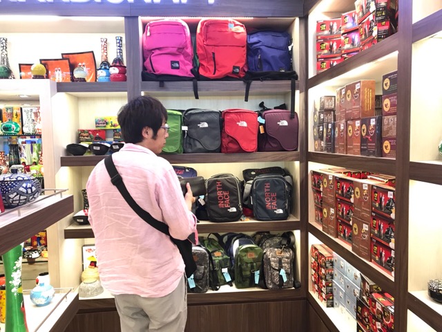 飛行機を待っている間に空港内のお店をブラブラしていたのですが、なんと、空港にも「ノースフェイス」のTシャツやカバンが。