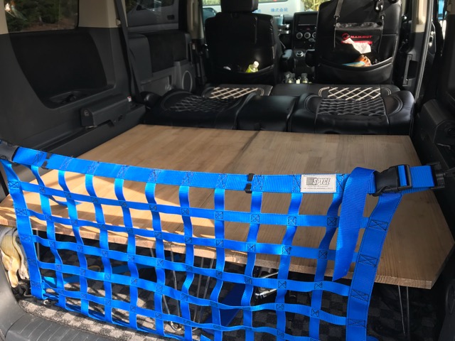 「みんカラ」の諸先輩方達に習って作ってみたのですが 普段は荷物積み込み時のセパレーターとして「下は長物(釣竿等)、積み重ねて潰れてはいけない物」「上にはそれ以外の物」と荷物を分ける事ができますし フルフラット仕様にするとベッドキットに早変わり(板部分には銀マットを敷きます)。