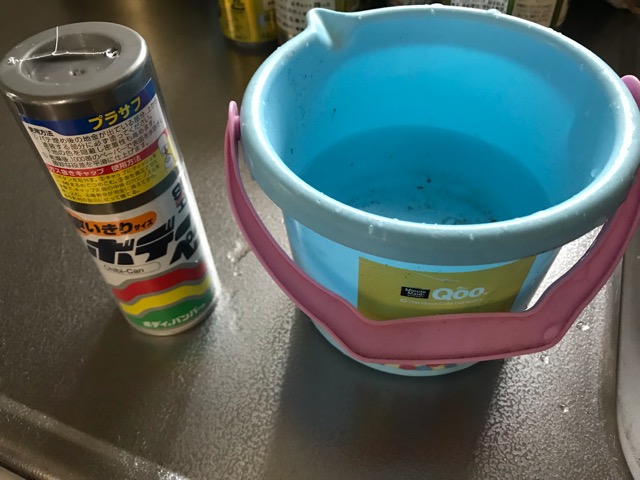 しばらく乾燥させてから「プラサフ」を吹くのですがスプレーを吹く前に40c前後のお湯をバケツに溜めてその中でスプレー缶を温め、よく缶を攪拌(振る)します。
