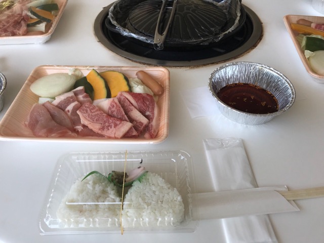 (おにぎり2個、淡路牛、豚肉、焼き野菜)