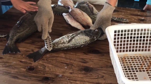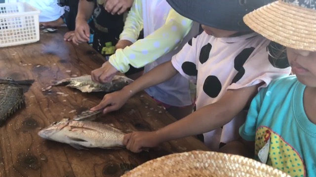 鯛の鱗取りの体験も出来たので息子と娘に1匹ずつ鱗取りをさせてもらう事に。