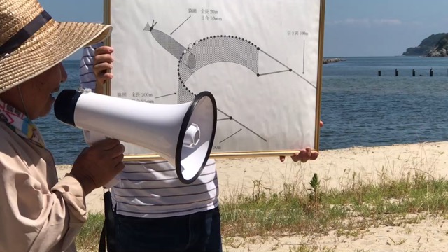 砂浜に着くと漁協のおじさんから地引網の説明があります。