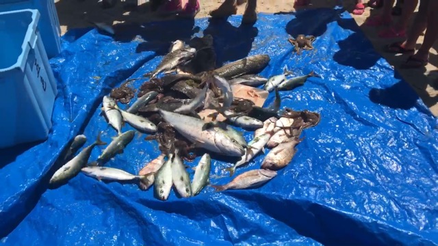100メートル近く沖まで網を降ろしその後グルリと回りながら再び砂浜まで近づきもう一本のロープを降ろします。