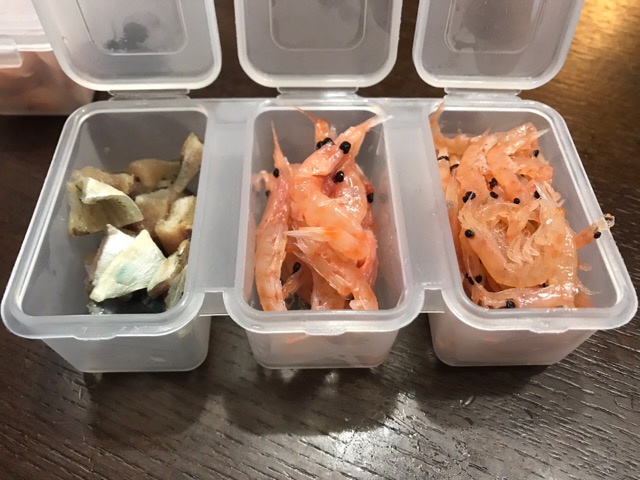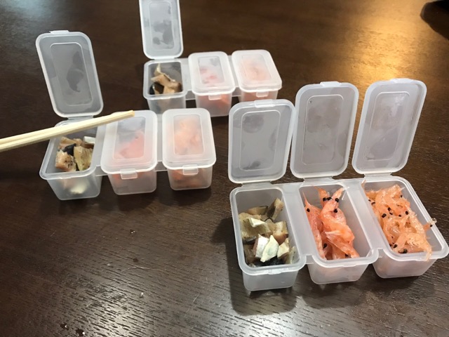 あと冷凍庫にあった「生イキ君」や「サンマ」の切身等もダイソーの「小分けタッパー」で3種類を3分割。