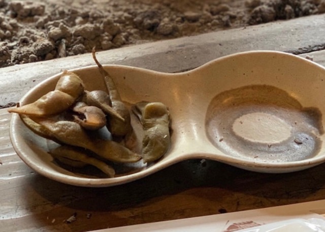 席に着き、メニュー表を見ているとまずは「つきだし」「黒豆の枝豆」が。