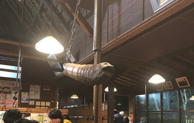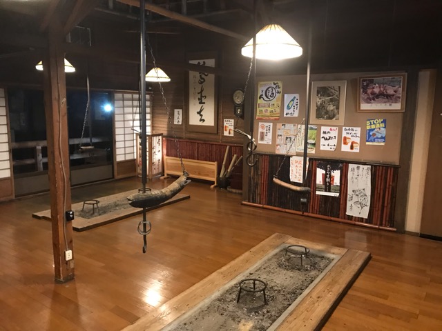 店員さんが一度鍋を上へと上げてくれてそのまま囲炉裏の上に網に乗った「山賊焼き」を置いてくれます。