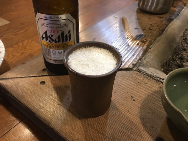 ビールを飲みながら店員さんから「ボタン鍋」の作り方を聞きます。
