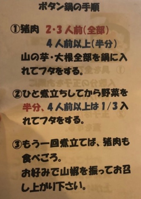 「いわや」さんでの「ボタン鍋」の提供は11/20〜3/20くらいまで、との事でシーズン終盤ですがなんとか予約が取れました。