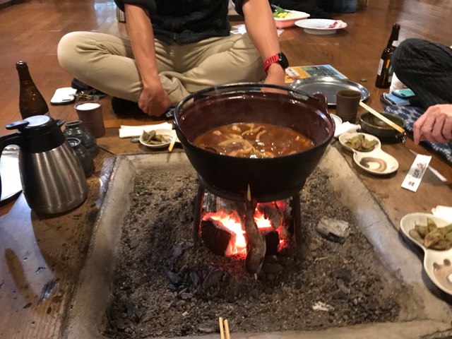 「山賊焼き」も食べ終わったので再び鍋を降ろしてもらい、ぼたん鍋を頂きます。