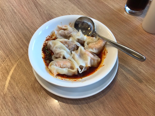 まだまだ食べます。「紅油抄手(エビ)/ピリ辛茹でエビワンタン」