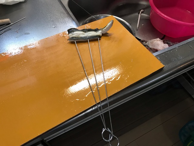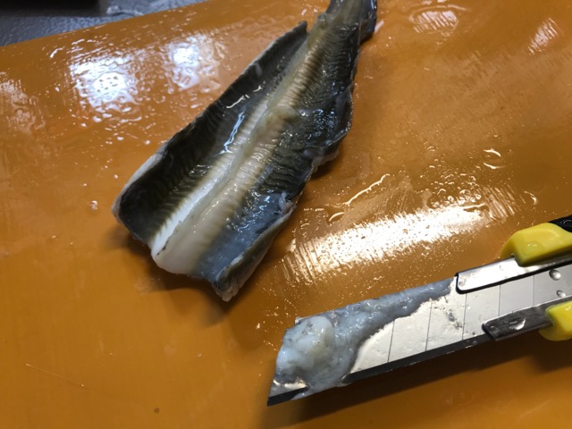 開き終わったら内蔵を取り腹骨をカッターでシゴきます。