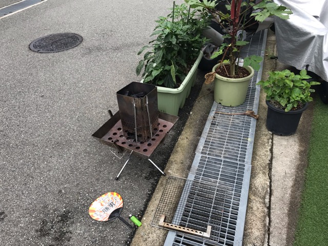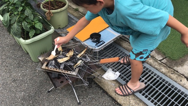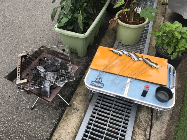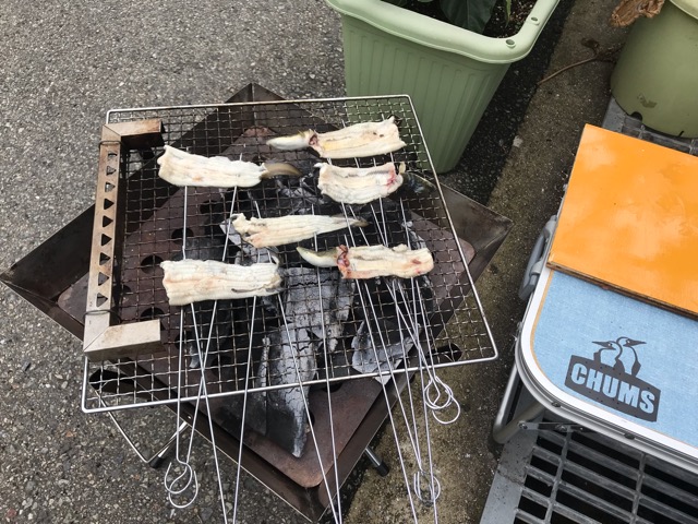 玄関前では事前から炭を起こしていたので蒲焼の準備は整いました。
