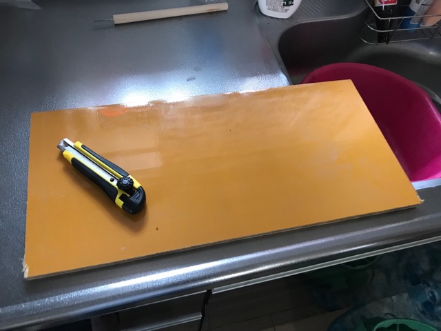 ウナギが動かない事を確認してコンパネの切れ端をまな板がわりにしてダイソーで購入した「キリ」で目打ちをします。