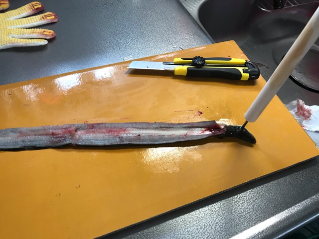 手早く作業をしないとウナギが動き出すのは前回の蒲焼で勉強済みなのですぐさま「カッターナイフ」で背中から開いていきます。