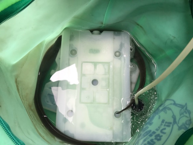 まずはアジバケツで活かしていたウナギ達に静かになってもらう為に「保冷剤」を投入。